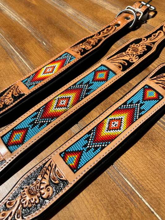 Western Tooled Leather Beaded Dog Collar - Aztec Beaded