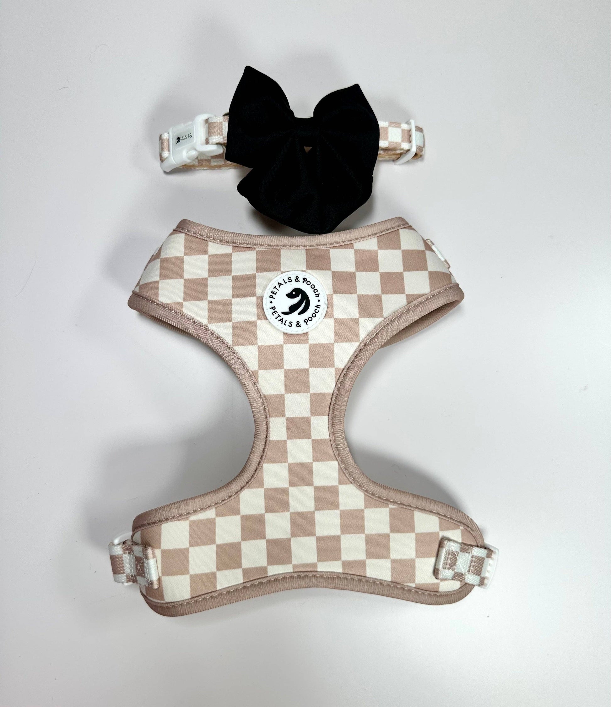 A classic tan & cream checkerboard pattern with a tan trim and silver hardware. A great neutral! Great for boy & girl pooches!