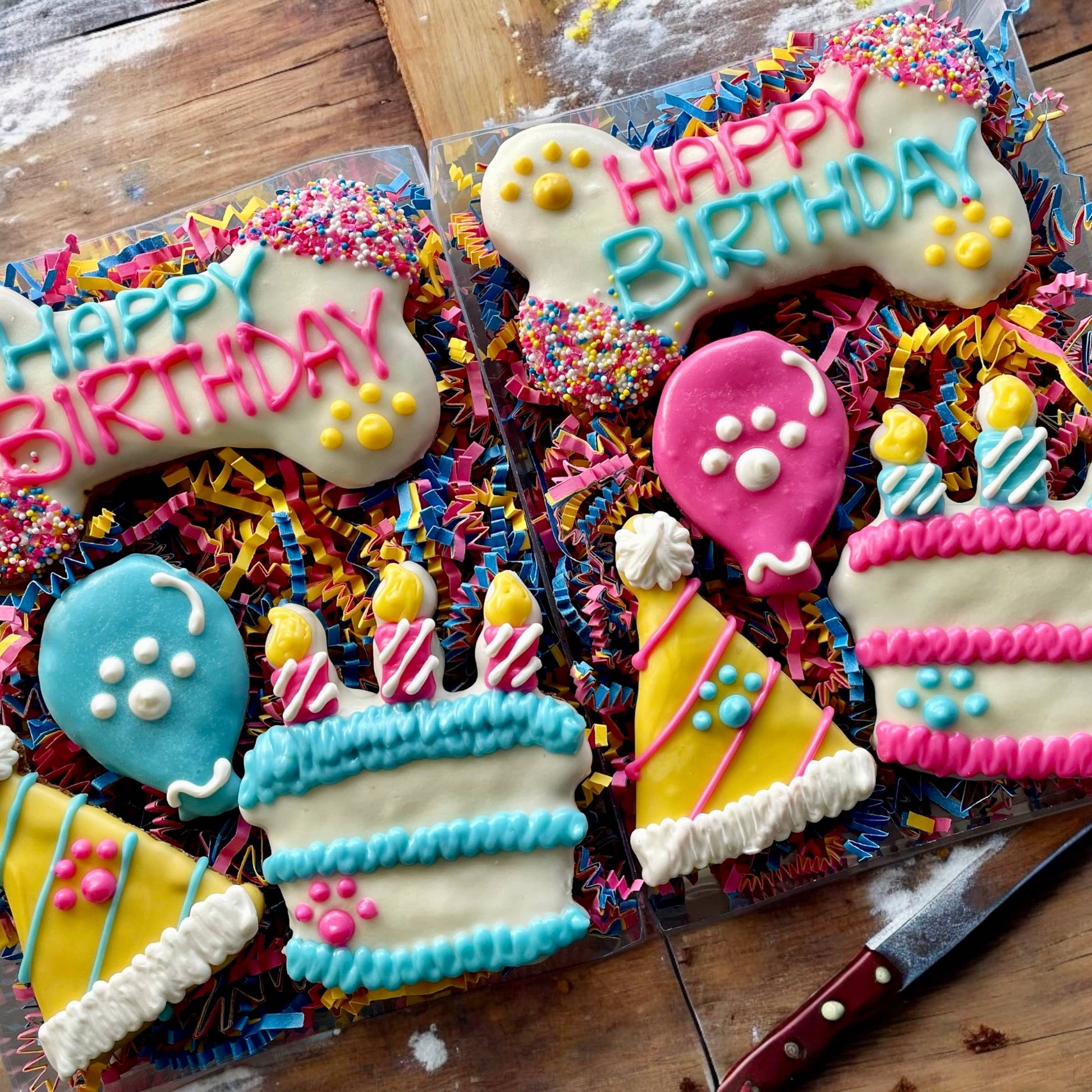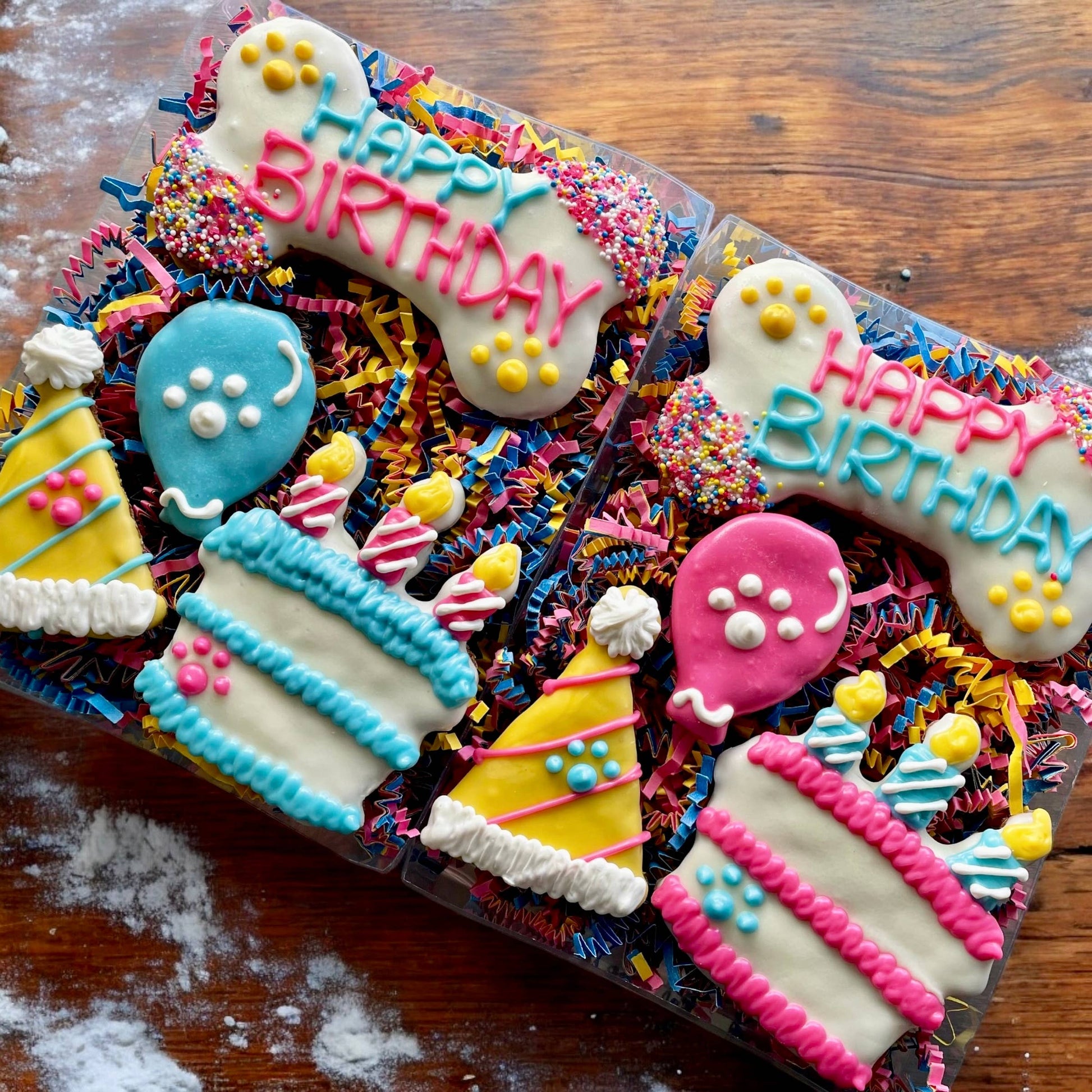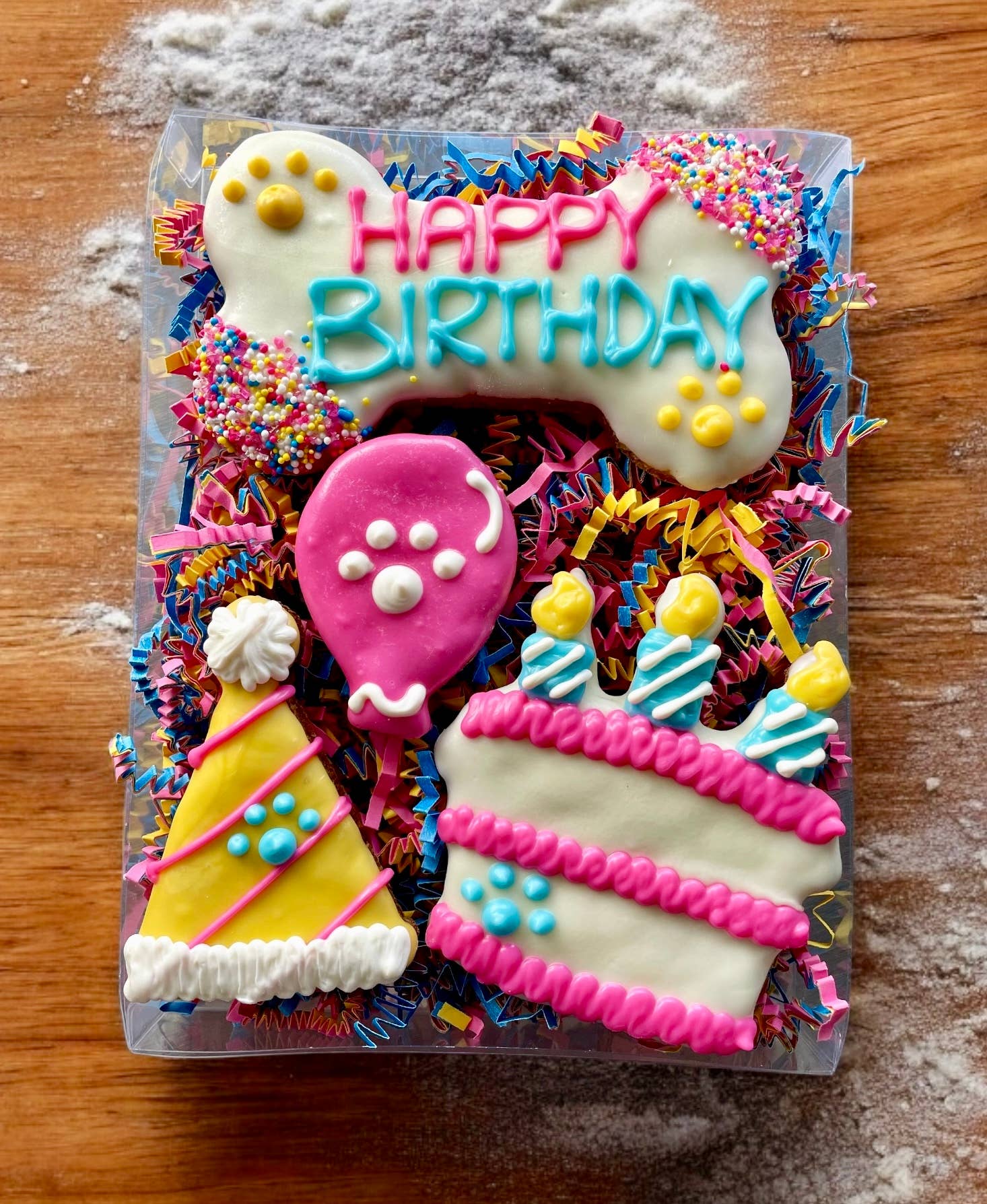 Celebrate pups birthday, Barkday or gotcha day with this festive birthday dog treat gift box of 4 handcrafted yumyums! Handcrafted from only quality all natural ingredients, all trests are baked with love in small batches. This gift box is 7.5x5.5 with each treat hand dipped in natural yogurt icing, then hand decorated with love! Store treats at no greater than 72 degrees out of direct light to avoid meltage. 6-12 month shelf life if stored properly (out of direct light, in cool, dry area) Ingredients: Peanut Butter, Whole Wheat Flour, Canola Oil, Cinnamon, Oats, Eggs and Honey. Crude Analysis: Crude Protein (min.)..13.0% Crude Fat (min.).........10.0% Crude Fiber (max.)......2.2% Moisture (max)……….…3.5%