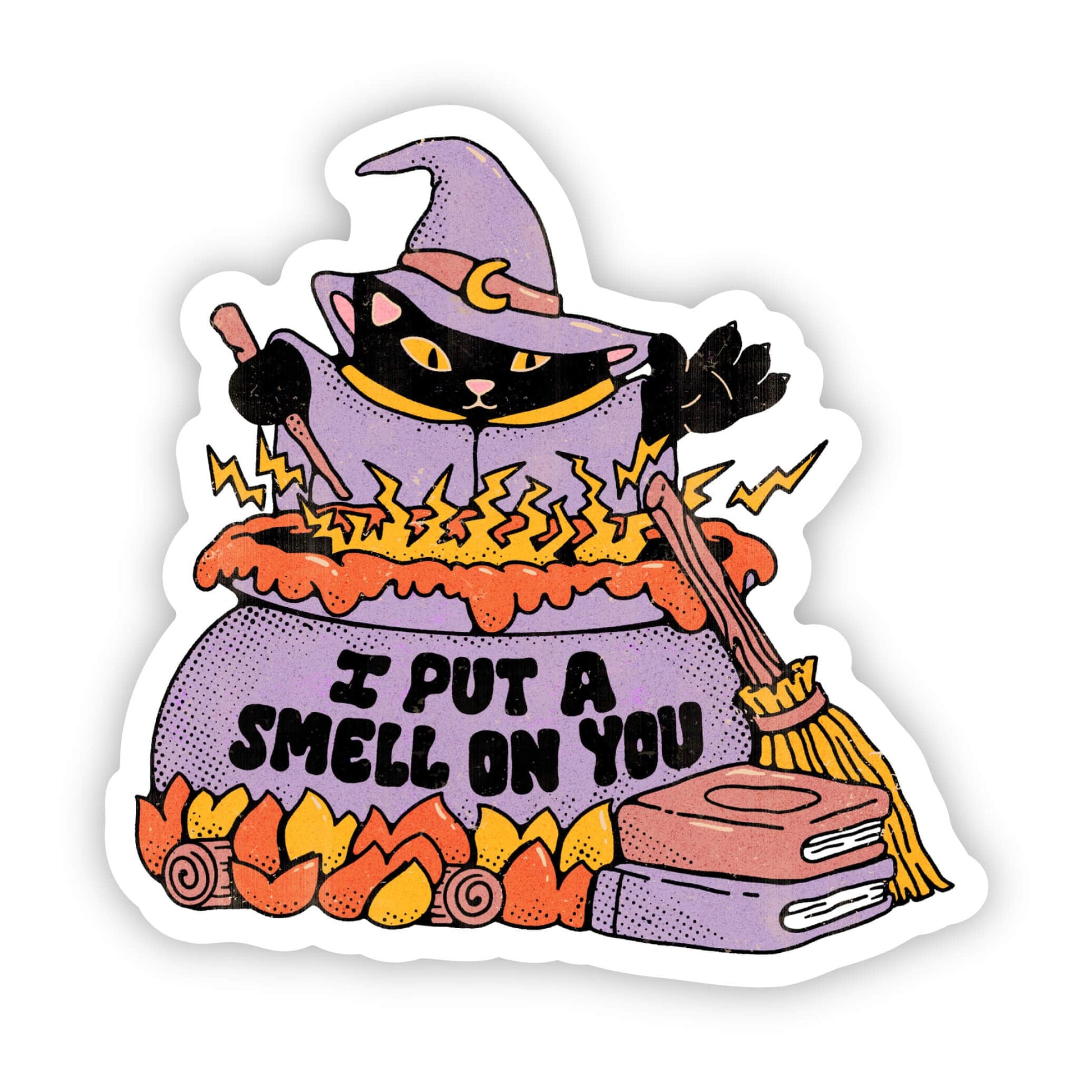 Punny witch cat fall and halloween sticker. High quality vinyl sticker. Great to decorate laptops, water bottles, car windows, coolers, phone cases, journals, suitcases, and more. This sticker is part of our fall and autumn sticker collection.