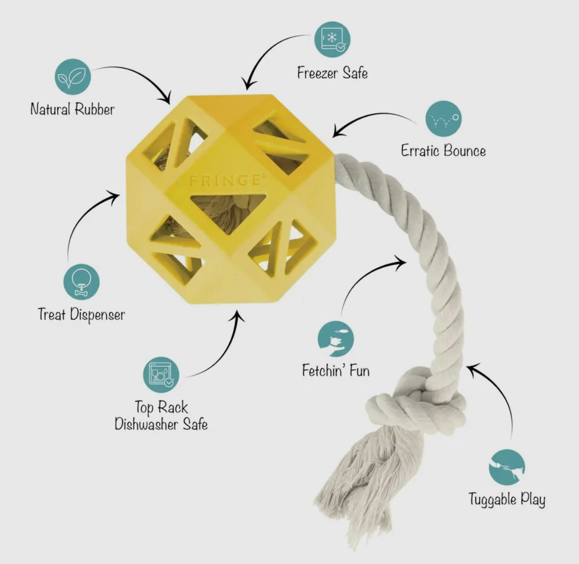 Ready to join the Dura-Club? This rubber dog toy is for pups that love to work for their treats, chew, and play lots of fetch. Made with natural rubber, a treat dispenser, tuggable rope, and an erratic bounce, this toy was created for long lasting interactive play. Simply toss it for some fetching fun or fill it with treat to keep your pup busy trying to get them out. Great for all size dogs and strong chewers.